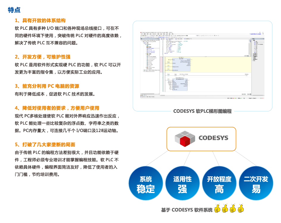 軟PLC綜合了計算機(jī)和 PLC的開關(guān)量控制、模擬量AD/DA控制、數(shù)學(xué)運算、網(wǎng)絡(luò)通訊等功能,通過 個多一任務(wù)控制內(nèi)核,提供強(qiáng)大的指令集、快速而準(zhǔn)確的掃描周期、可靠的操作和可連接各種I/0系統(tǒng)及網(wǎng)絡(luò)的開放式結(jié)構(gòu)。軟PLC開發(fā)環(huán)境實際上是帶有調(diào)試和編譯功能的PLC編譯軟件,符合IEC61131-3標(biāo)準(zhǔn),支持五種編程語言:如結(jié)構(gòu)化文本(ST)、順序功能圖(SFC)、功能塊圖(FBD)、梯形圖(LD)和指令表(IL) , 可以自定義數(shù)據(jù)類型,用戶可以在同一項目中選擇不同的語言編輯子程序,功能模塊。