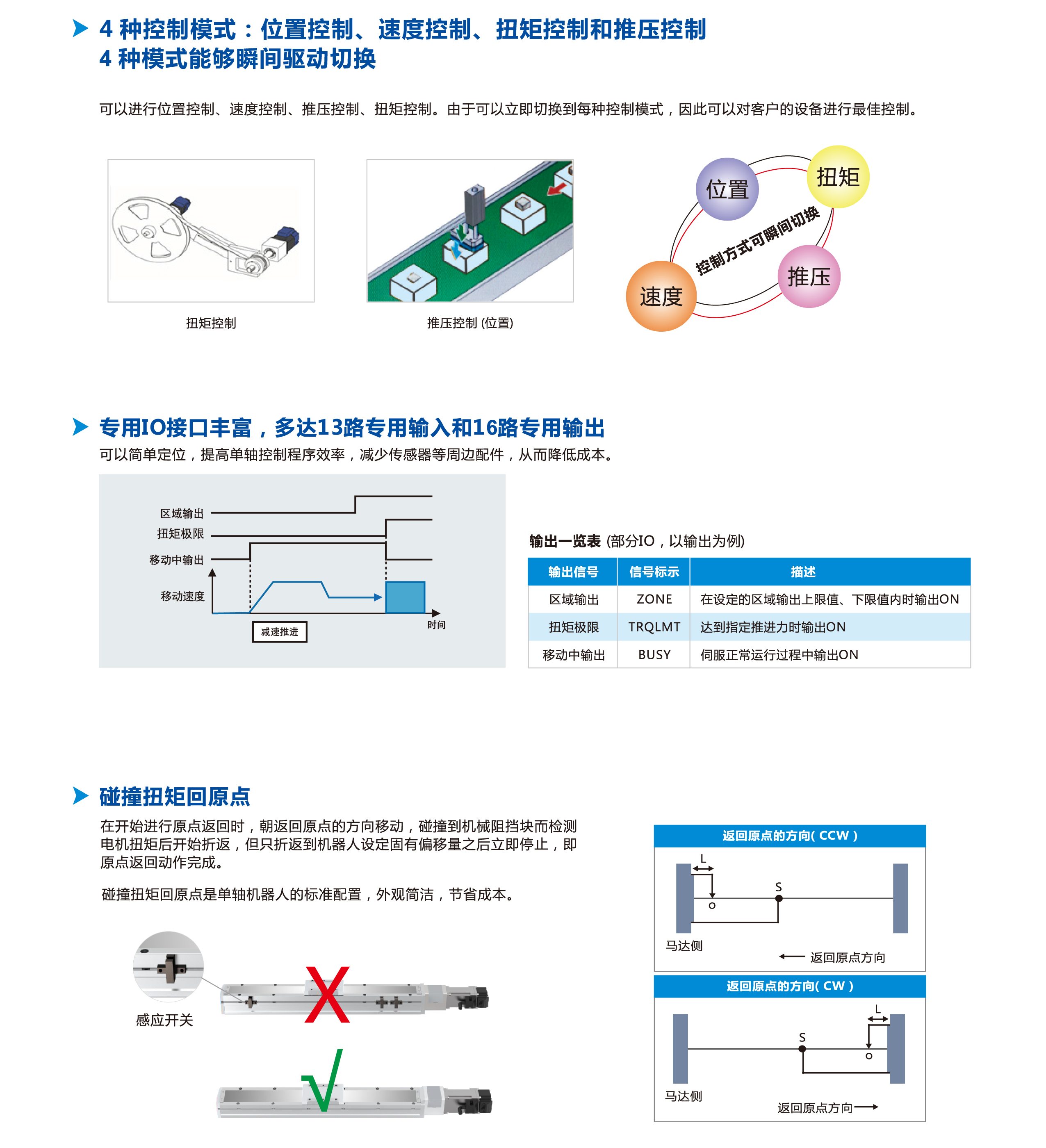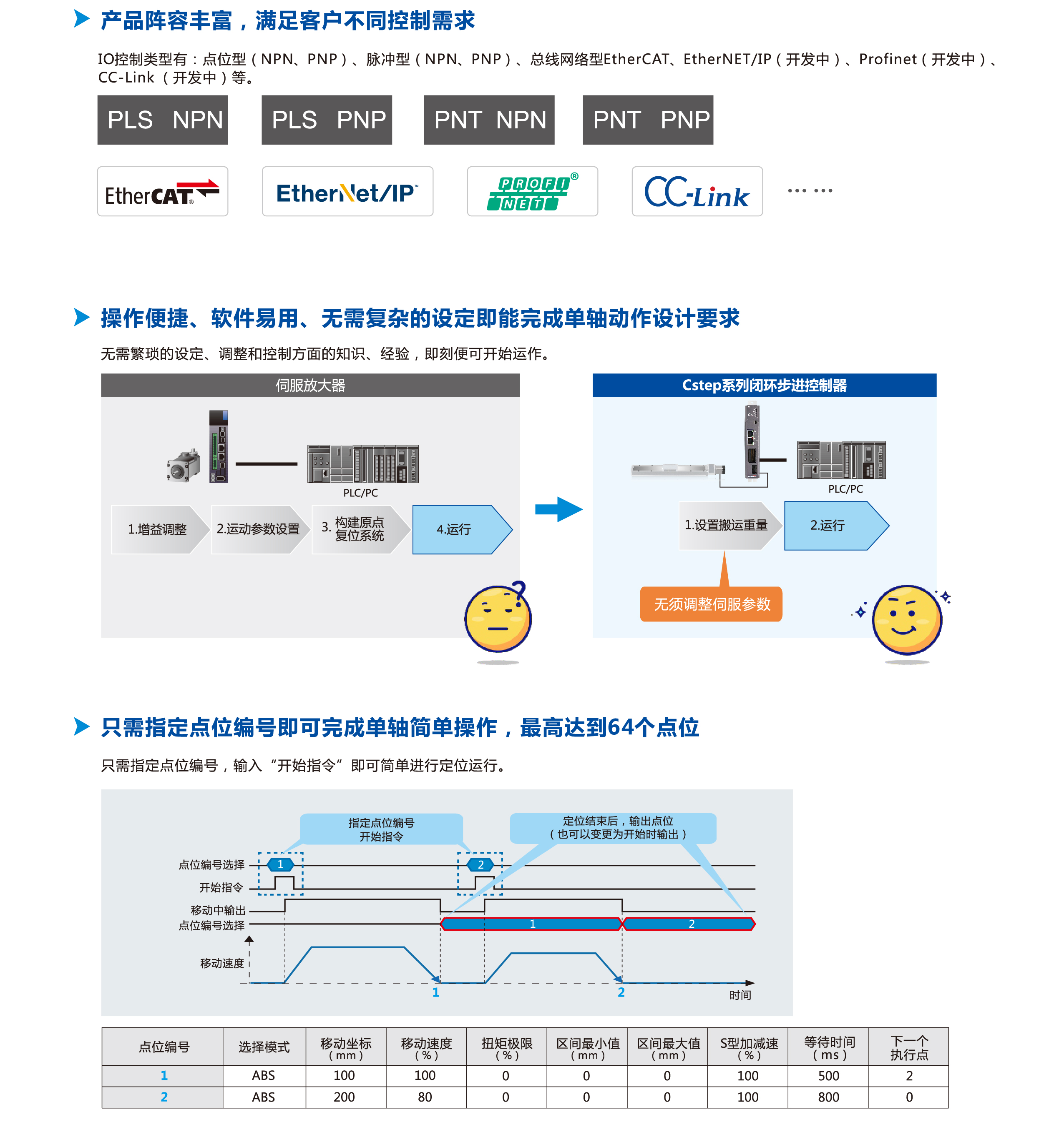Cstep系列閉環(huán)步進(jìn)單軸控制器是基于混合式二相閉環(huán)步進(jìn)電機(jī)的勵(lì)磁電流精準(zhǔn)控制而開發(fā)的。 1臺控制器具有位置控制、 速度控制、扭矩控制、 推壓控制4種工作模式,實(shí)現(xiàn)高響應(yīng)高扭矩、 低速高扭矩,編碼器分辨率為16000PLS/r , 達(dá)到伺服電機(jī)性能要求,性價(jià)比高,特別適合集成于單軸滑臺電缸、 電動夾爪的位置、 力度等精準(zhǔn)控制。