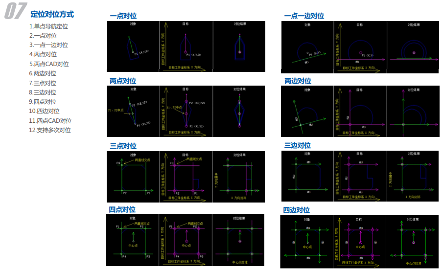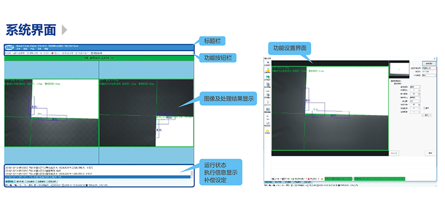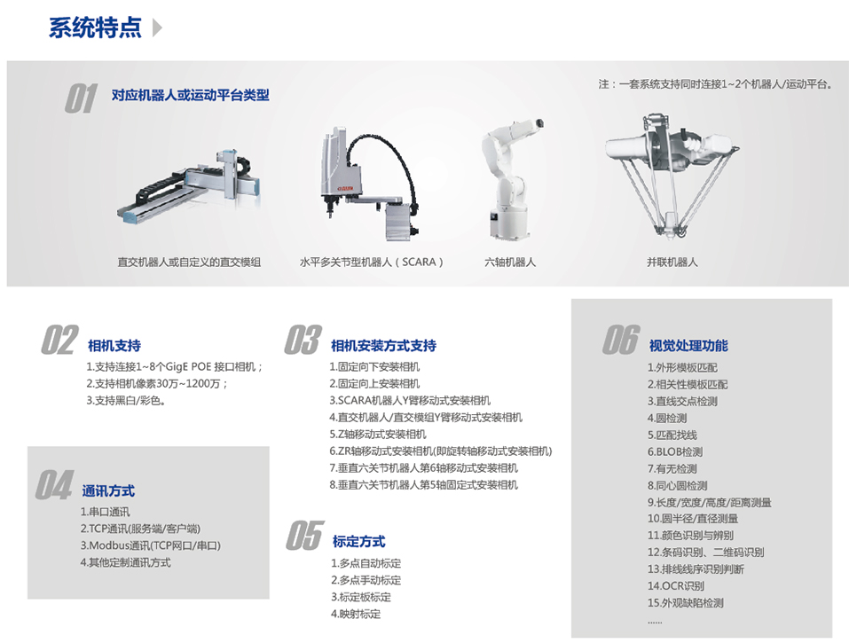 多種多樣的圖像處理功能與視覺定位對位功能,滿足各種各樣的定位對位需求及測量、檢測、識別等需求,不但功能豐富還可以根據(jù)客戶需求進(jìn)行功能定制。 多種定位對位補(bǔ)償算法,補(bǔ)償自動計(jì)算,大大節(jié)約調(diào)試時間。多種通訊方式,滿足不同類型的通訊需求。支持幾乎所有類型的工業(yè)機(jī)器人運(yùn)動平臺和直交運(yùn)動模組。