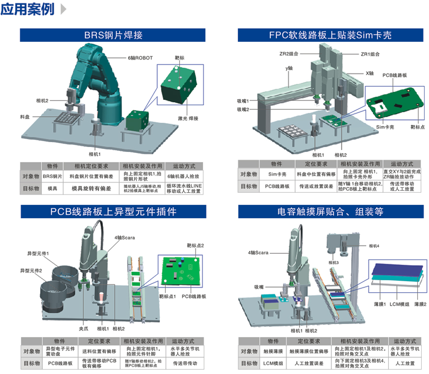 BRS鋼片焊接、FPC軟線路板上貼裝SIM卡殼、PCB線路板上異型元件插件、電容觸摸屏貼合、組裝等。